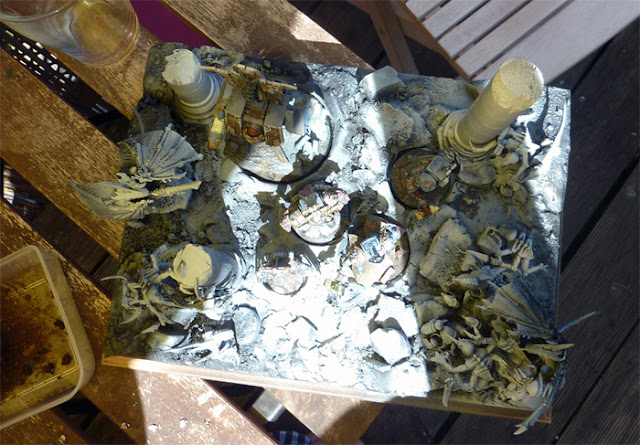 The basework ?s mainly done, for sure snow and icicles are still missing and is It is already primed and after some chat with the comissioner there will be a snowy and windy athmosphere with some icicles... here are some Work in Progress shot - i am looking forward to use the Airbrush now for a first colour go after this posting. I hope you don't mind many photos of this Work in Progress - such photos always help me to get a better feeling for the scene or just see something from a very nice angle...